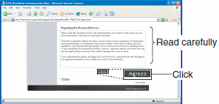 5. Zapoznaj się dokładnie z “Regarding this Download Service”; (Uwagi dotyczące usługi ściągania plików) i wówczas kliknij na przycisk wyrażenia zgody [AGREE]. |