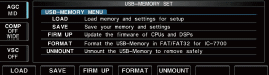 Kiedy aktualizujemy oprogramowanie firmware przy użyciu pendrive USB nie jest potrzebne ustawienie adresu IP ani maski podsieci. 1. Skopiuj ściągnięte i rozpakowane dane firmware na pendrive USB (do folderu “IC-7700”). pendrive USB musi być sformatowany przez IC-7700. 2. Wsuń pendrive USB do złącza USB. 3. Jeśli potrzeba, nacisnij kilkakrotnie EXIT/SET aby zamknąć wielofunkcyjny ekran. 4. Naciśnij [SET] F-7 aby wybrać wstawienie trybu ekranowego menu. 5. Nacisnij [USB] F-7 aby wybrać ustawienie menu USB-Memory.