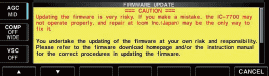 Aktualizowanie oprogramowania firmware jest bardzo ryzykowne. Jeżeli popełnisz błąd, IC-7700 może nie pracować prawidłowo i naprawa przez Icom Inc (Japonia) może być jedyną drogą by to naprawić.