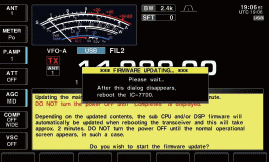 Oprogramowanie firmowe transceivera zostanie uszkodzone!!! 18. Po zniknięciu dialog, aktualizacja oprogramowania firmware jest zakończona i ukaże się ekran nornalnej pracy. tekst na lewym dialogu