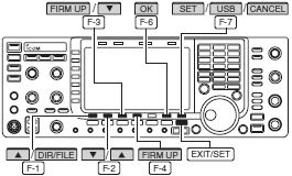Kiedy aktualizujemy oprogramowanie firmware przy użyciu pendrive USB nie jest potrzebne ustawienie adresu IP ani maski podsieci. 1. Skopiuj ściągnięte i rozpakowane dane firmware na pendrive USB (do folderu “IC-7700”). pendrive USB musi być sformatowany przez IC-7700. 2. Wsuń pendrive USB do złącza USB. 3. Jeśli potrzeba, nacisnij kilkakrotnie EXIT/SET aby zamknąć wielofunkcyjny ekran. 4. Naciśnij [SET] F-7 aby wybrać wstawienie trybu ekranowego menu. 5. Nacisnij [USB] F-7 aby wybrać ustawienie menu USB-Memory.