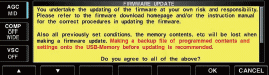 Również wszystkie poprzednie ustawione warunki, zawartość pamięci itp będą utracone kiedy wykonujemy aktualizację oprogramowania firmware. Zalecane jest przed aktualizacją wykonanie pliku kopii zapasowej programowanych stałych i ustawień do pamięci USB.