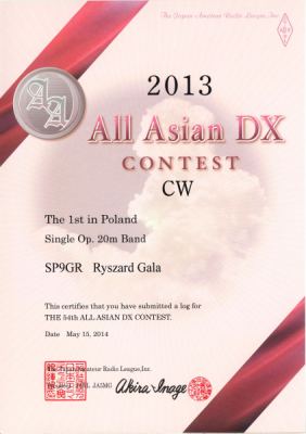 Drugi sukces Rysia to I miejsce w zawodach All Asia DX contest 2013 CW w kategorii Single Op. 20 m Band.